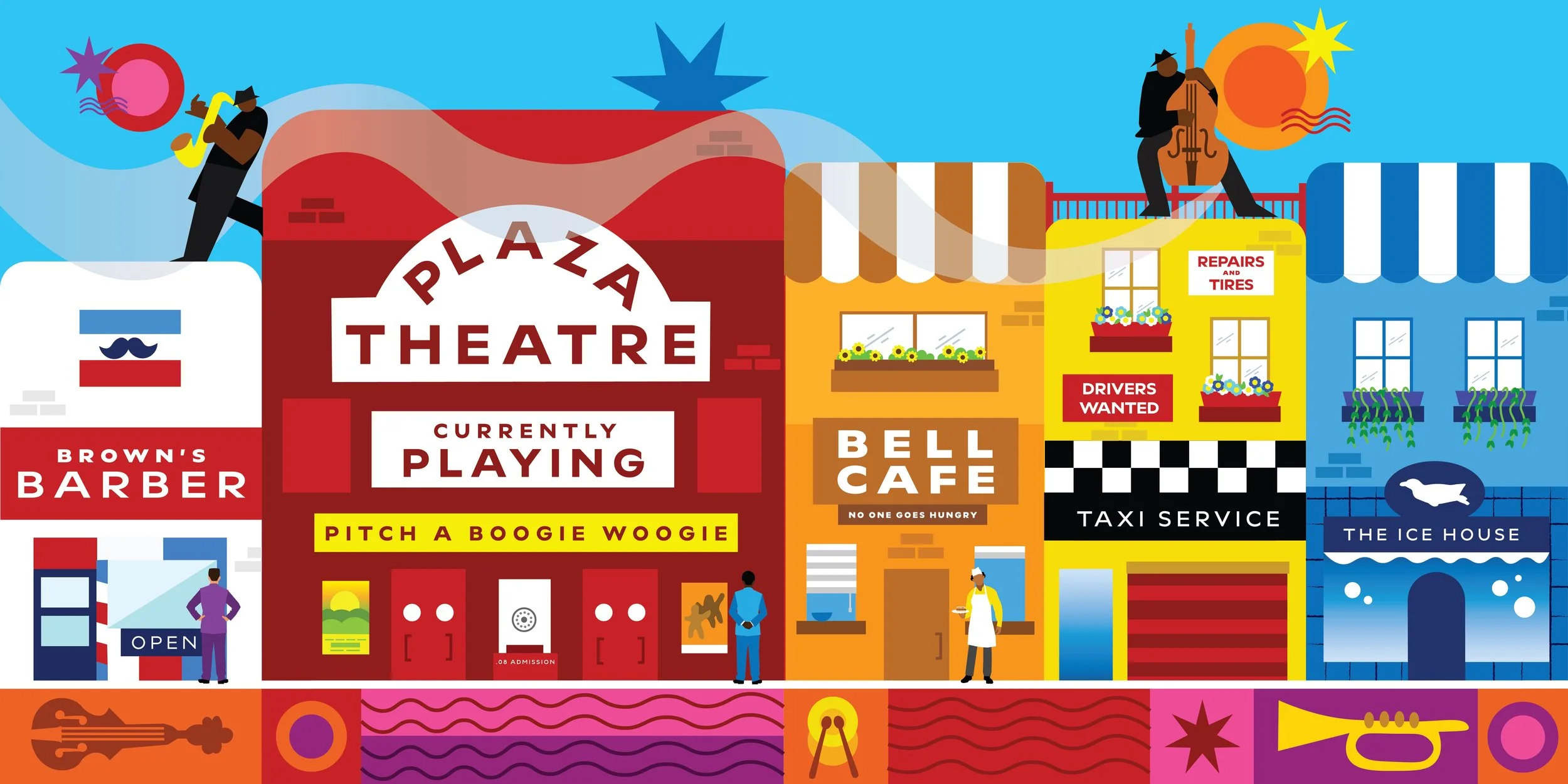 Jazz is represented in this piece as being the pulse and soundtrack of the Block. It leads you through the panels, and is played by the musicians of the visiting Winstead band, as well as aspiring Greenville musicians. This shows the power of jazz to energize a whole block, and accomplished the goal of reflecting the rhythm and energy of jazz.