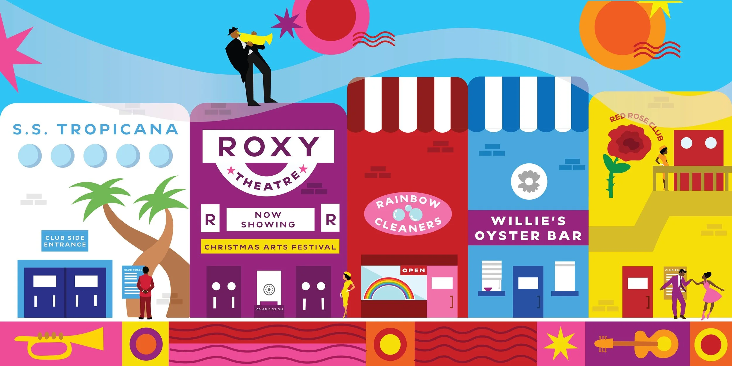 Highlights the businesses: the Red Rose Club, Willie’s Oyster Bar (Captain B. Willie), Rainbow Cleaners, Roxy Theatre (John Warner), and the S.S. Tropicana club.